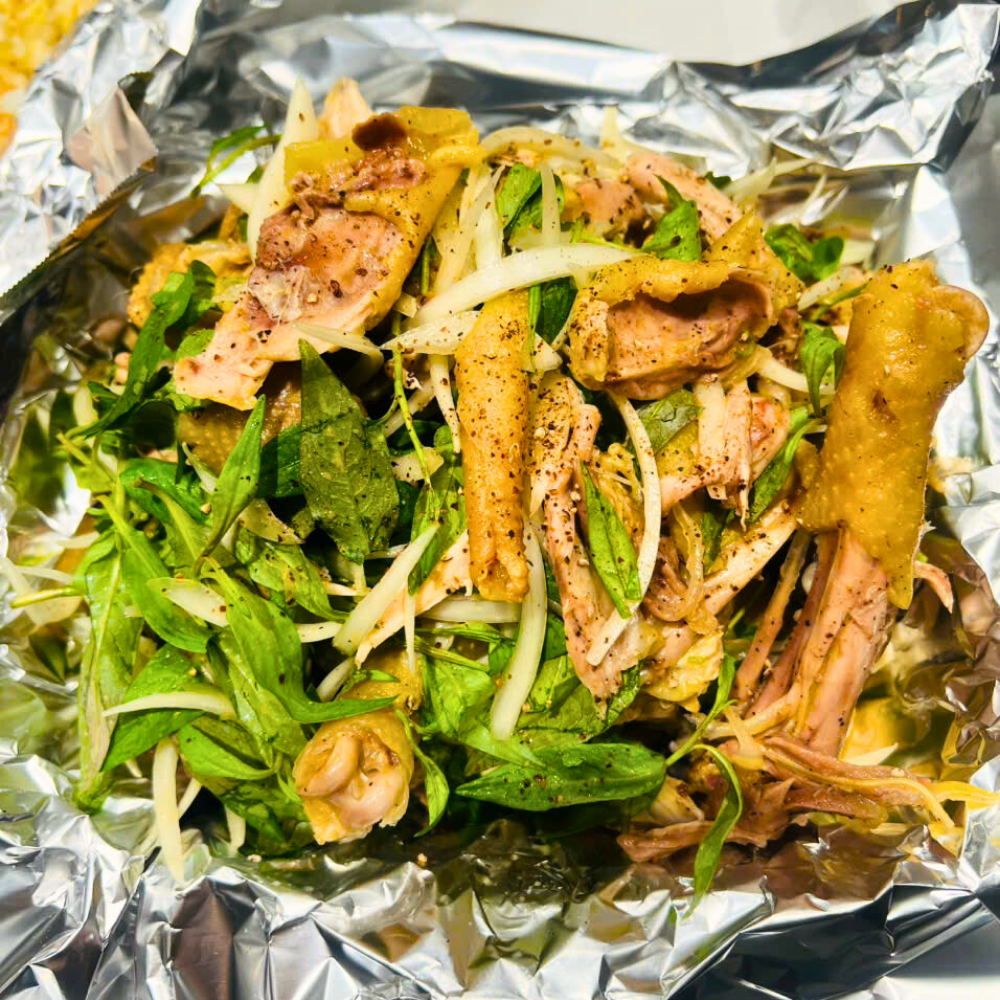 Gà ta luộc chín tới, thịt săn chắc, dai ngọt tự nhiên, được xé nhỏ và trộn cùng rau răm, hành tây, tiêu, chanh và nước mắm tỏi ớt đặc trưng. Món gỏi gà được ăn kèm với xôi nếp dẻo thơm, tạo nên sự kết hợp hài hòa giữa vị thanh của gỏi và độ no, béo nhẹ từ xôi. Thích hợp làm món chính hoặc ăn lai rai cùng bạn bè.